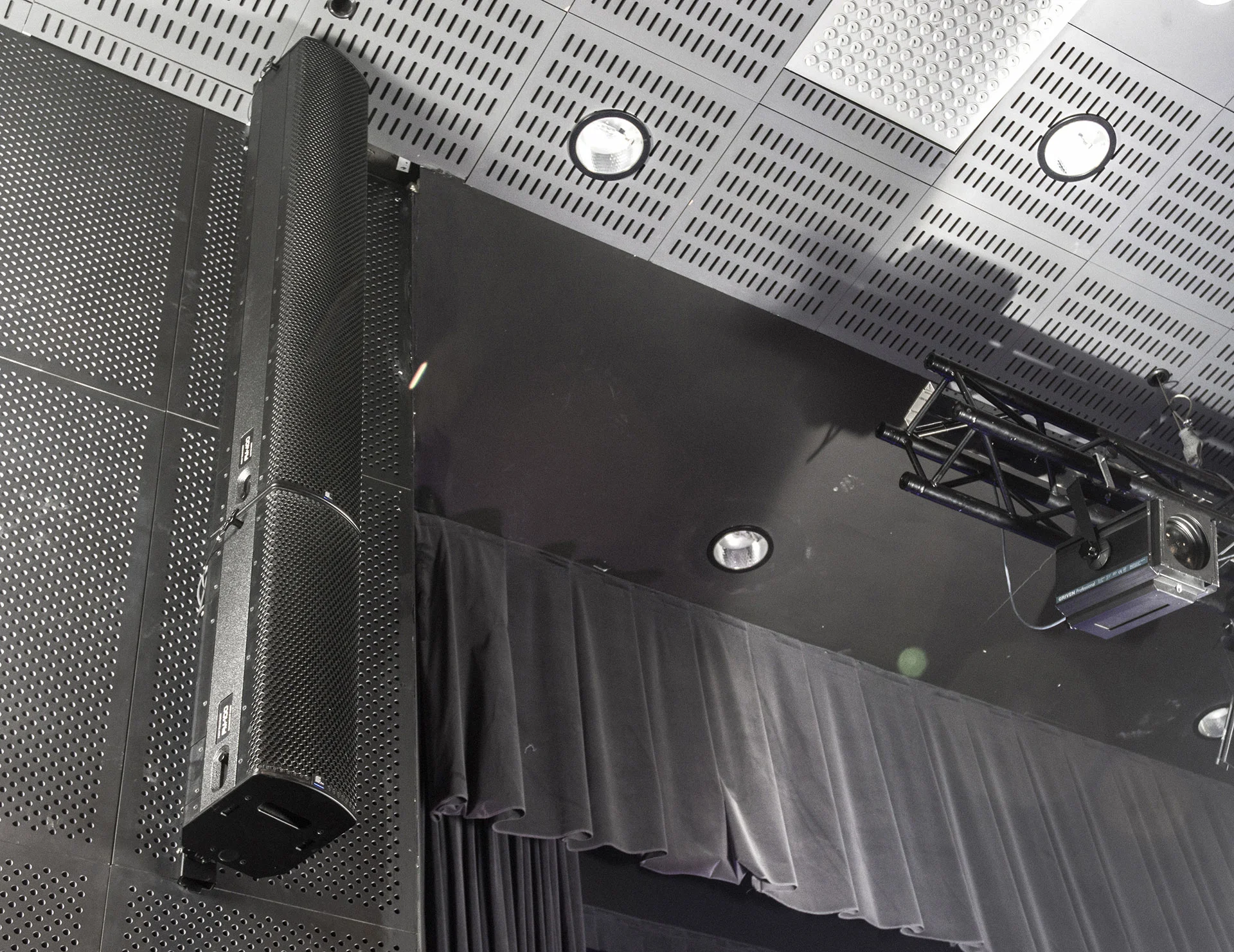 W Sali widowiskowej zaimplementowaliśmy po raz pierwszy w Polsce specjalistyczny system liniowy o sterowanej wiązce dźwięku. Uzupełnieniem głównych kanałów są dwa wysokowydajne zespoły głośnikowe, superniskotonowe, wyposażone w przetworniki o średnicy 21”. System posiada również kanał front fill, dla uzupełnienia obrazu dźwiękowego w pierwszych rzędach widowni.