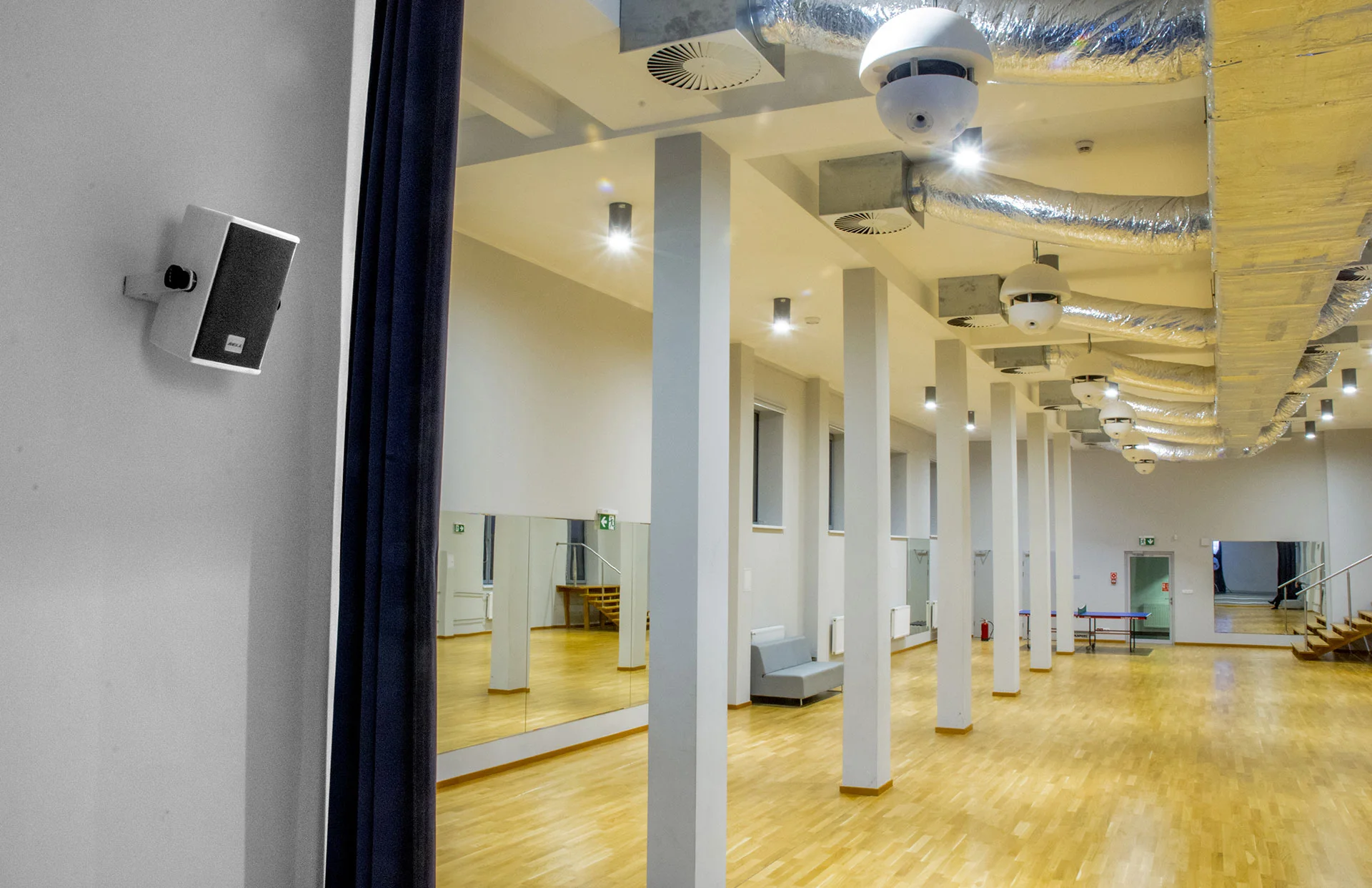 Sala ćwiczeń tanecznych jest długim pomieszczeniem, z rzędem kolumn usytuowanym w 1/3 szerokości Sali. Aby zachować prawidłowy czas dotarcia dźwięku do tancerzy na całej powierzchni Sali zastosowaliśmy unikalne zespoły głośnikowe, pełnopasmowe, zainstalowane pod sufitem. Do obsługi sprzętu przeznaczony jest prosty sprzęt, z typowym mikserem rackowym. Mikrofon prowadzącego zajęcia (nagłowny) pracuje w układzie kaczki, pozwalając prowadzącemu na skupienie się na zajęciach, bez potrzeby ustawicznego kontrolowania poziomów muzyki do ćwiczeń i jego mikrofonu