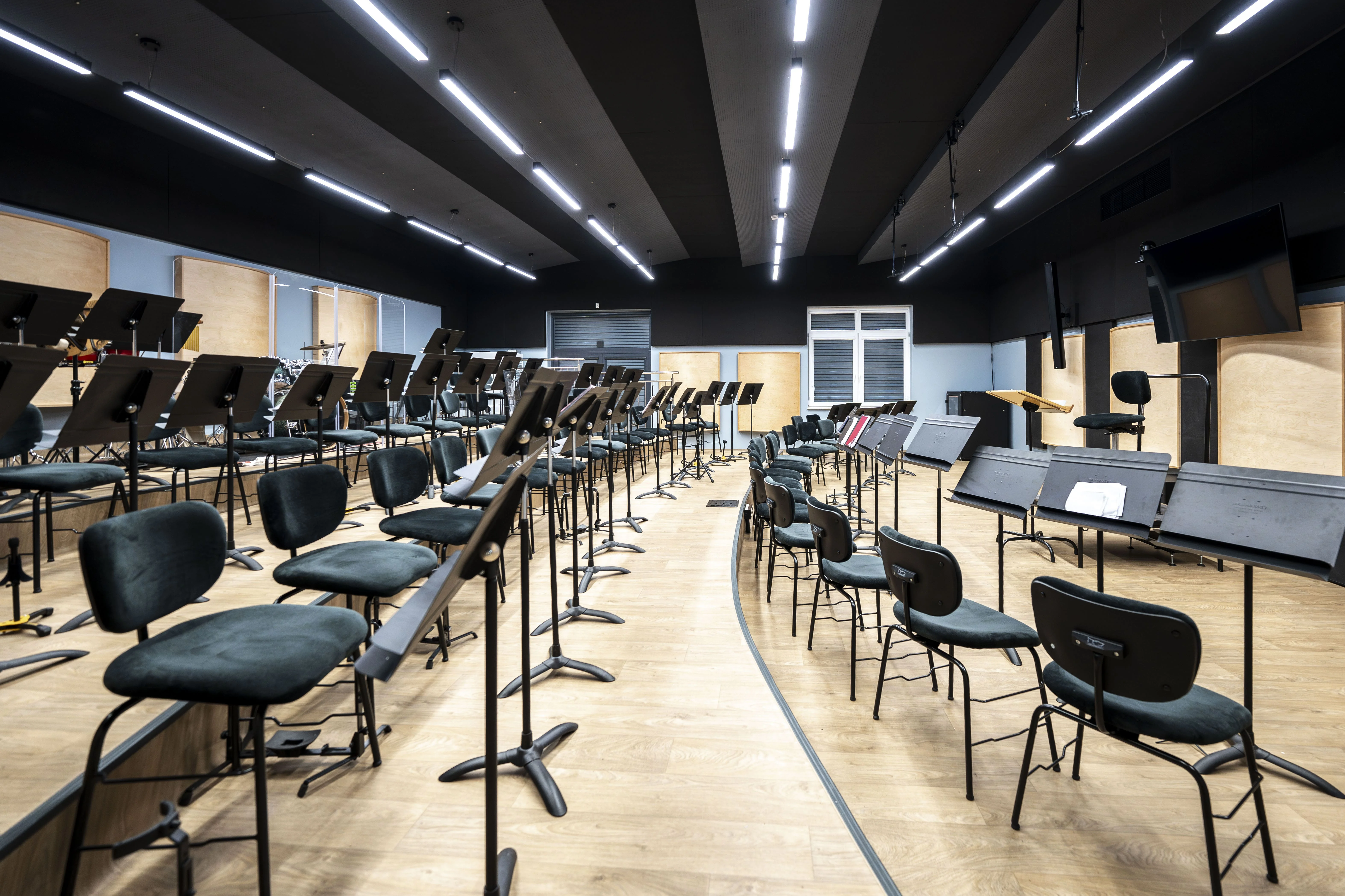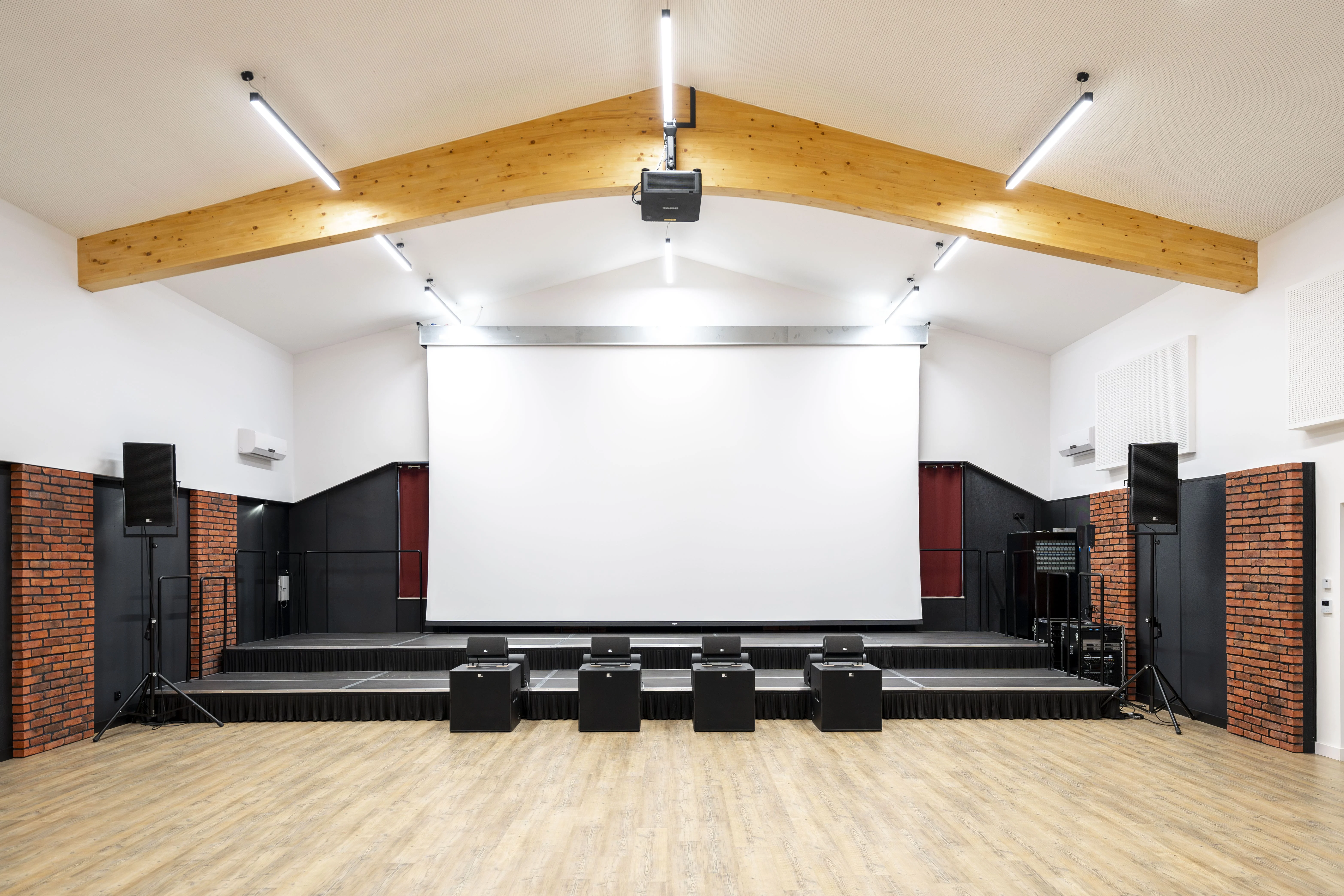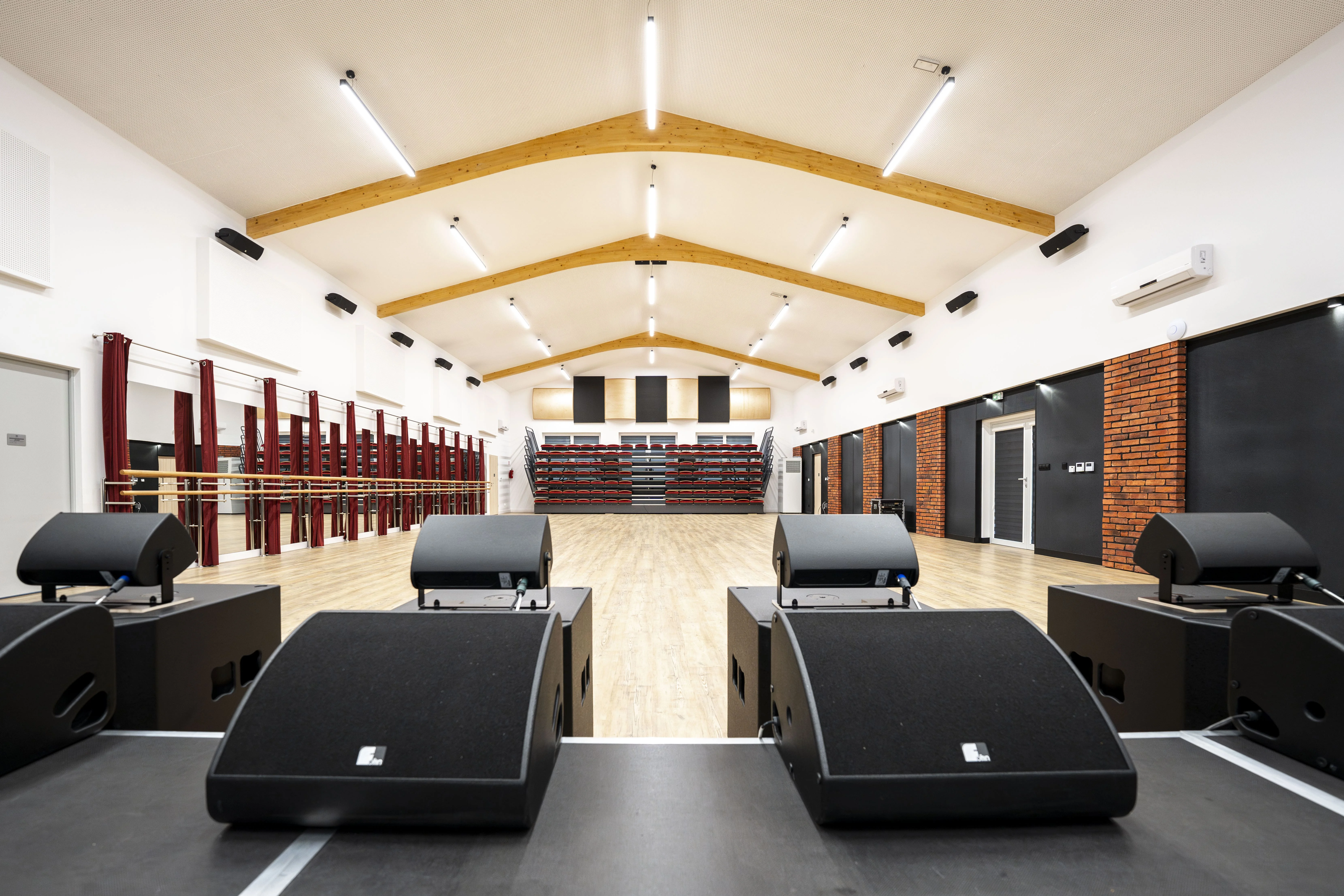 To jedna z naszych najciekawszych realizacji. Z reguły obiekty w niewielkich ośrodkach sprowadzają się do niedużych sal o uniwersalnym przeznaczeniu. W tym przypadku było jednak zupełnie inaczej. Życzeniem Inwestora było wyposażenie Sali widowiskowej, wydzielenie w niej odrębnej części do prób zespołu mażoretek oraz opracowanie studia nagraniowego dla orkiestry dętej. Wybrnęliśmy z zadania bardzo dobrze. Efekt końcowy przerósł oczekiwania Inwestora.