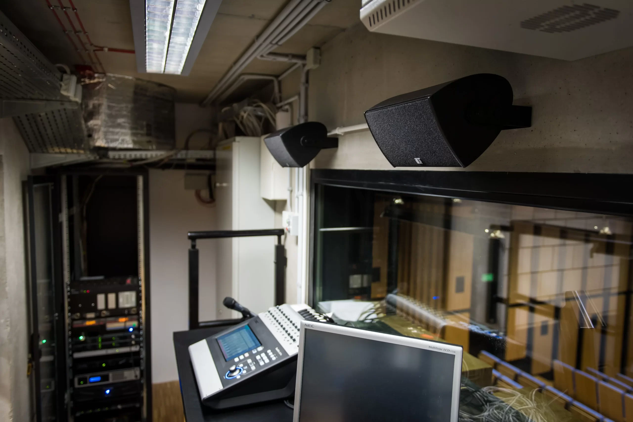 Dopełnieniem systemu głośnikowego są specjalistyczne monitory kontrolne, montowane na stałe. Ich zadaniem jest „zakrycie” dźwięku powracającego. Producentem systemu głośnikowego jest niemiecka firma Fohhn Audio A.G.