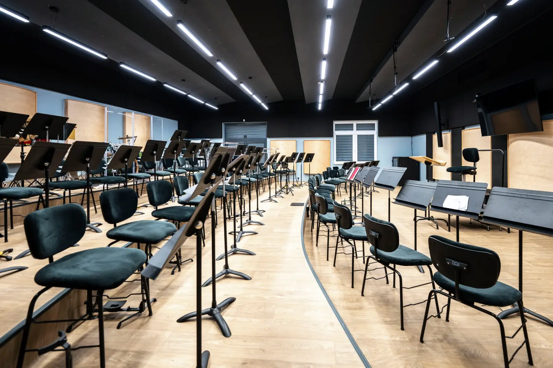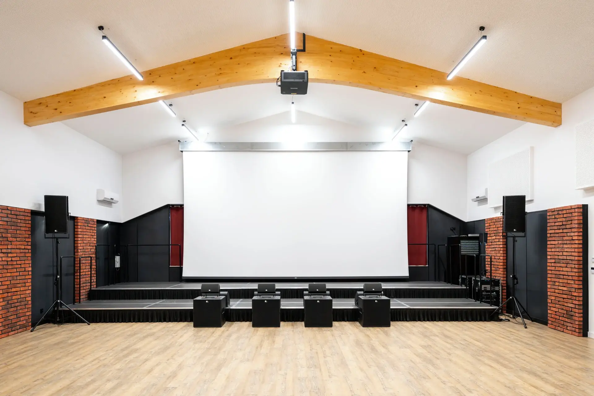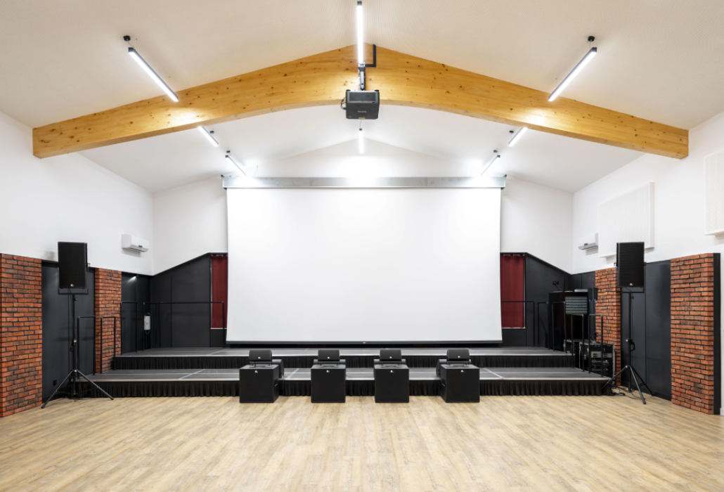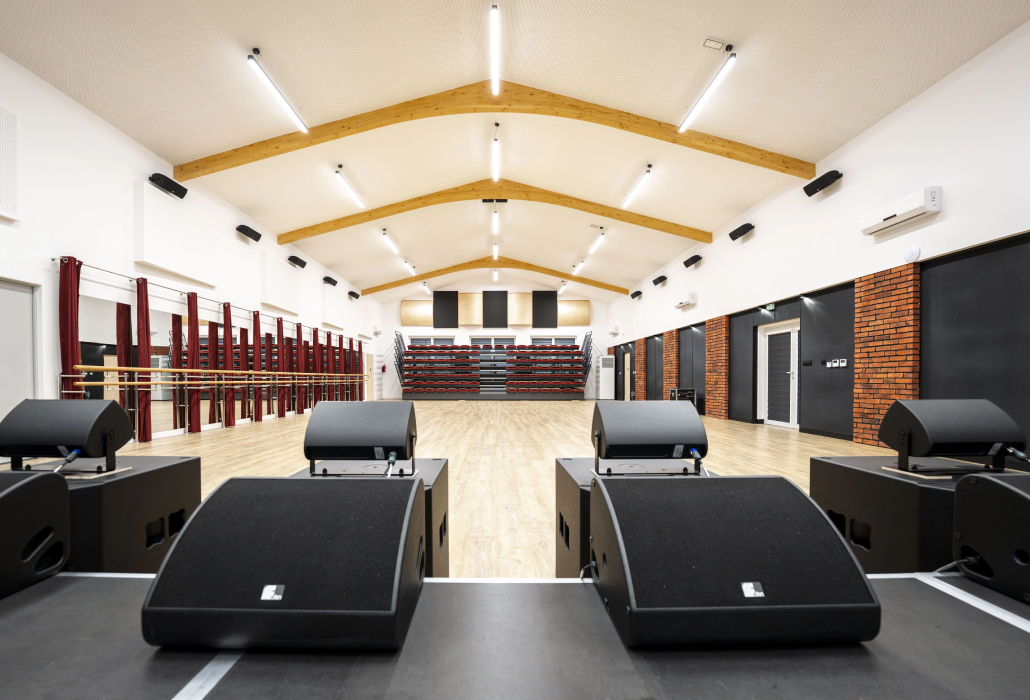 To jedna z naszych najciekawszych realizacji. Z reguły obiekty w niewielkich ośrodkach sprowadzają się do niedużych sal o uniwersalnym przeznaczeniu. W tym przypadku było jednak zupełnie inaczej. Życzeniem Inwestora było wyposażenie Sali widowiskowej, wydzielenie w niej odrębnej części do prób zespołu mażoretek oraz opracowanie studia nagraniowego dla orkiestry dętej. Wybrnęliśmy z zadania bardzo dobrze. Efekt końcowy przerósł oczekiwania Inwestora.